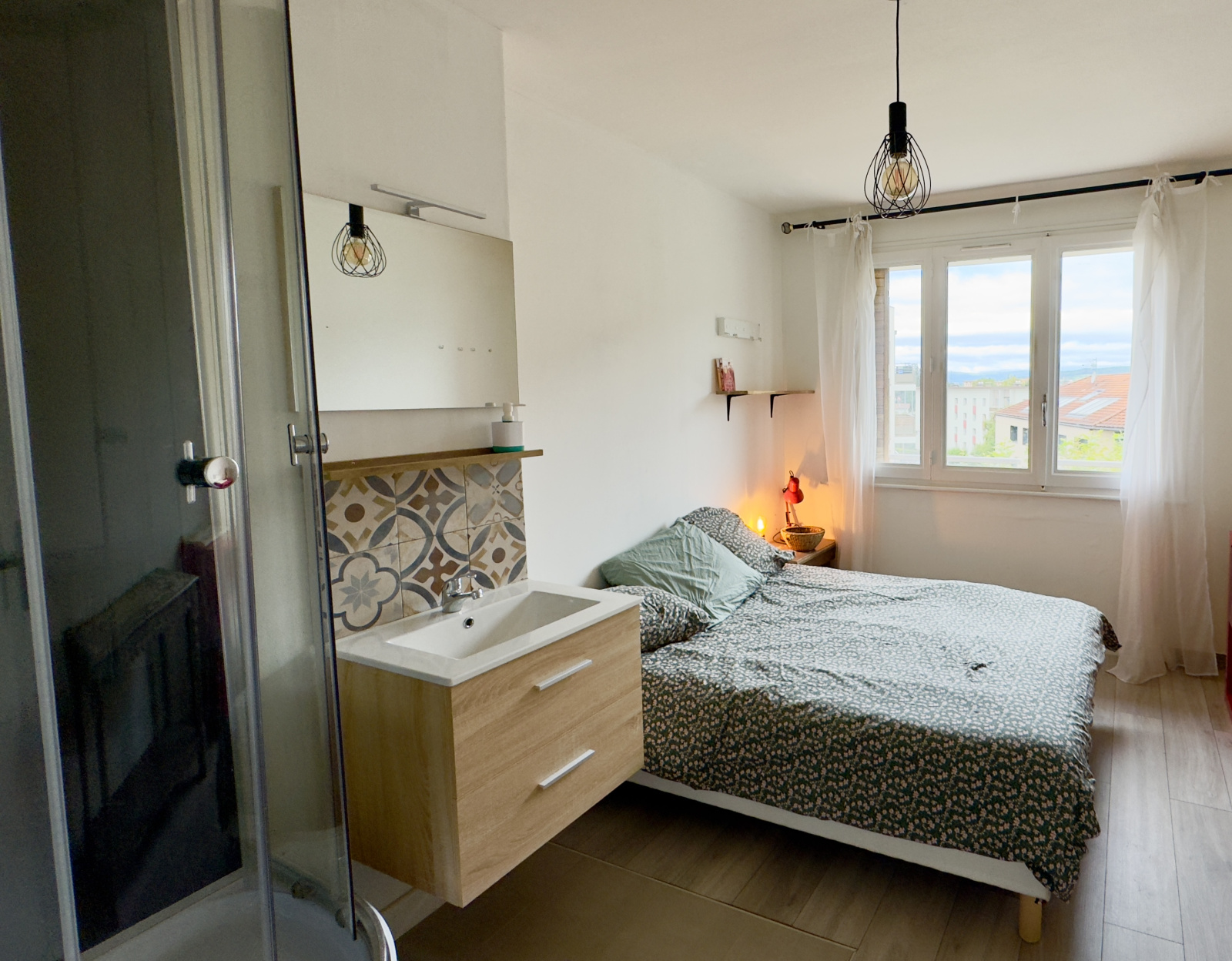 Il comprend une entrée, un salon avec cuisine et balcon, deux chambres dont l’une avec salle de douche et l’autre avec salle de bains, un WC.