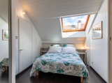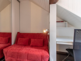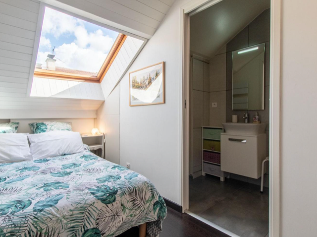 À l’étage, une chambre avec sa salle de douche et son WC, un espace ouvert qui peut servir de bureau et se transformer en couchage.
