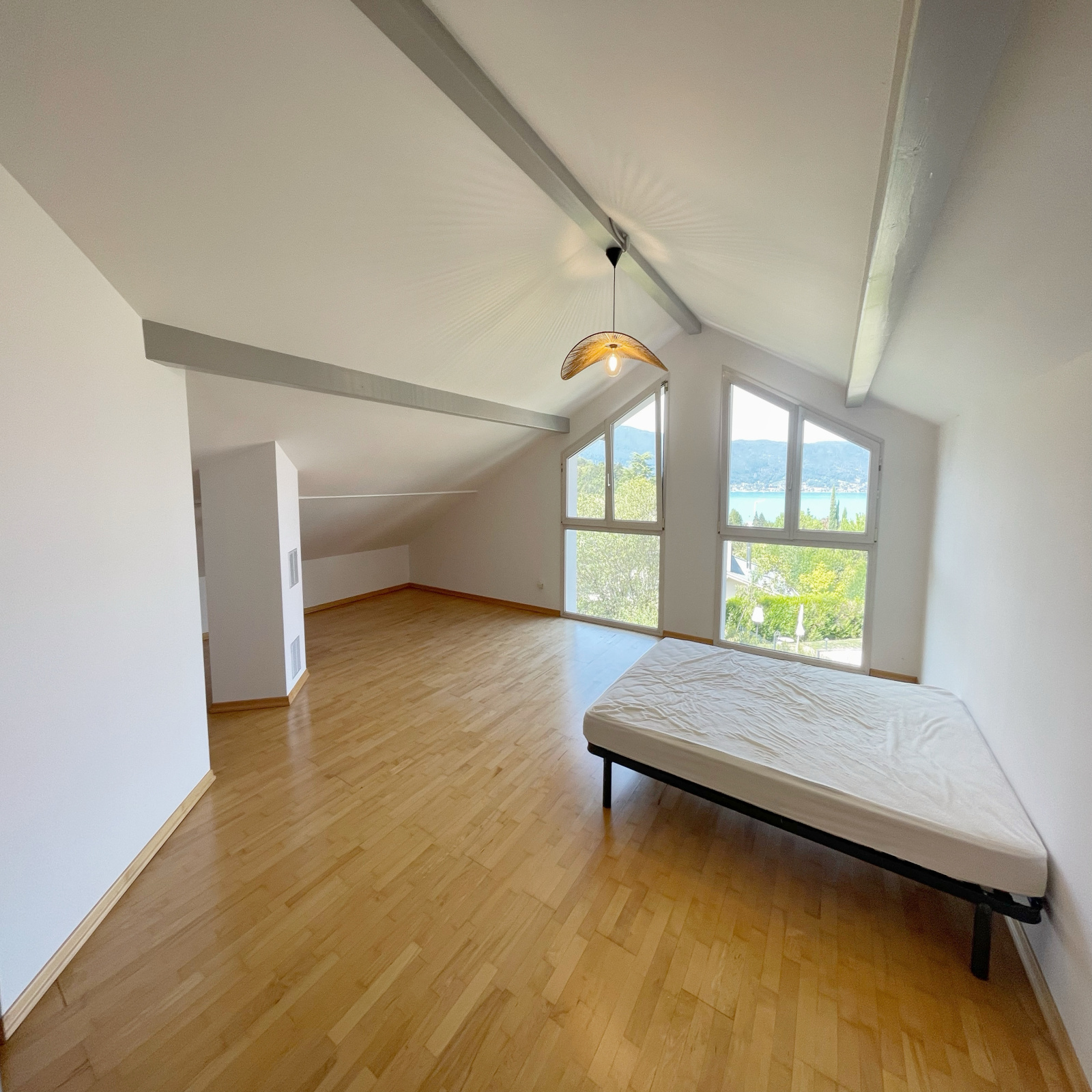 La maison dispose de trois chambres confortables (possibilité 4-5), deux chambres avec salle d'eau ainsi qu'une pièce dressing, à l'étage une grande surface avec vue lac pouvant être séparée par des cloissons.