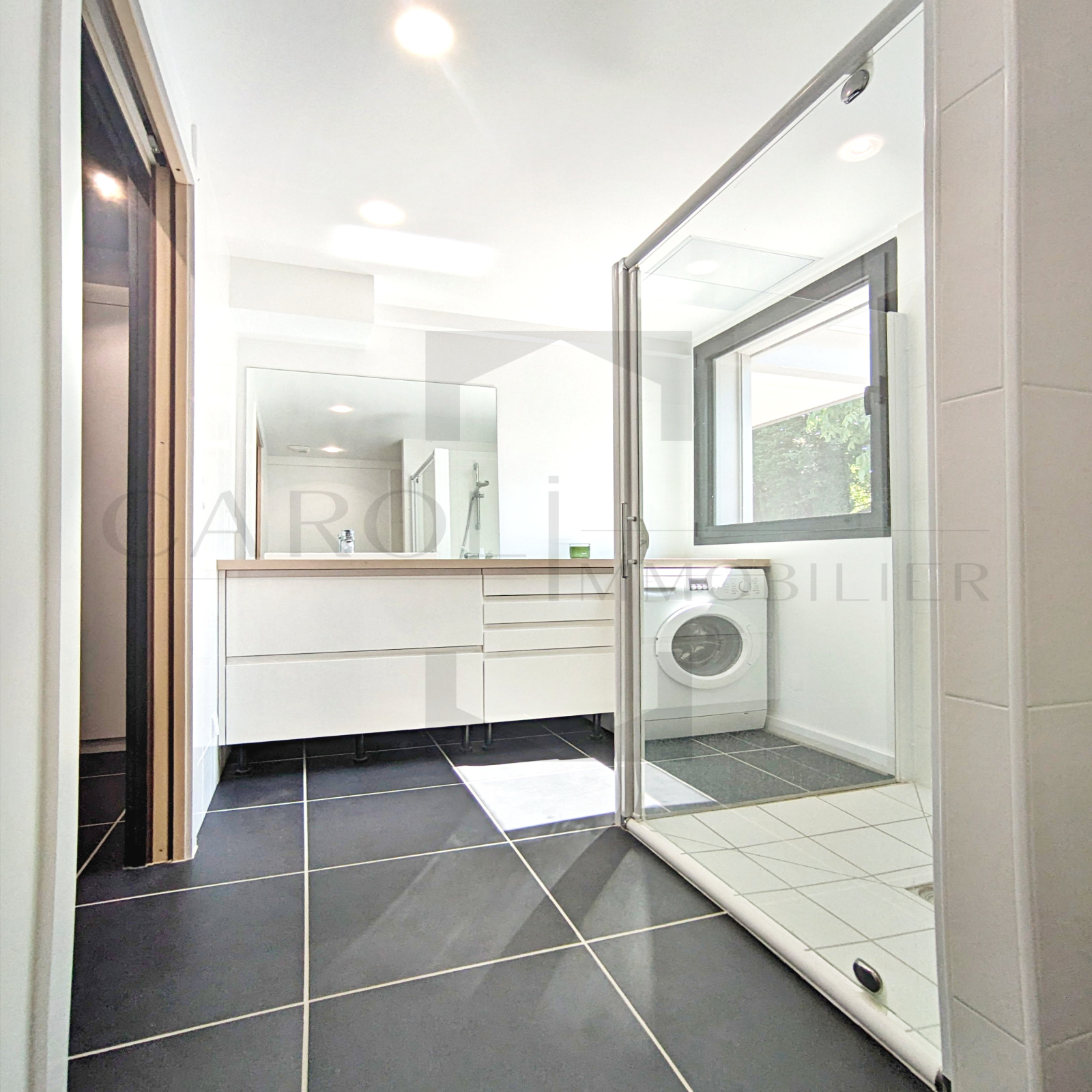 Cet appartement bénéficie d'une disposition claire et bien pensée, offrant un espace de vie spacieux et confortable. La luminosité inonde le salon et la cuisine grâce à de larges baies vitrées donnant sur une terrasse/jardin de 17m².