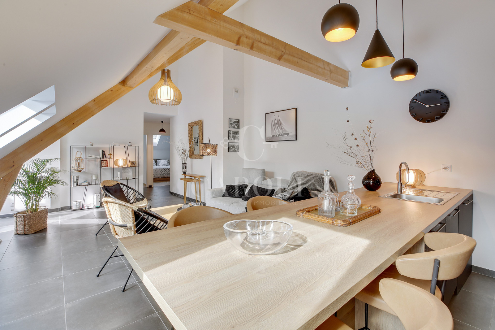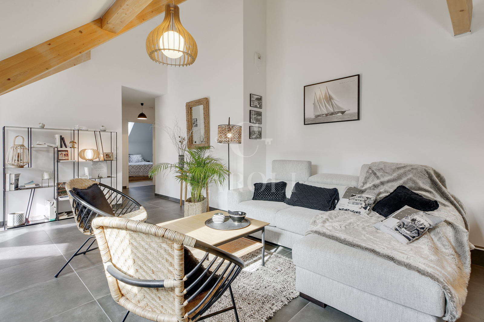 CAROLI TRANSACTIONS IMMOBILIÈRES vous propose en EXCLUSIVITÉ cet appartement d'exception de 64 m² dans une résidence de 2019 située en plein centre du quartier d'Albigny. L'appartement se compose d'une cuisine ouverte de qualité sur un spacieux salon cathédrale avec accès terrasse, de deux chambres dont une avec un grand dressing et d'une salle d'eau avec douche à l'italienne. Terrasse au calme et bien exposée pour la détente. Appartement d'une surface utile de 74 m², situé au 2ème et dernier étage sans ascenseur. Résidence intimiste, idéalement située, à quelques pas du lac. COUP DE COEUR - RARE À LA VENTE. Un garage de 16 m² en sous sol complète ce bien. Nombre de lots : 39. Charges annuelles : 1556 €. Pour plus d'informations ou pour organiser une visite, contacter Bruno au 06.98.89.34.54 (Agent Commercial au RSAC d'Annecy sous le numéro 497531541) ou par mail à bruno@caroli-immo.com - Visites 7/7