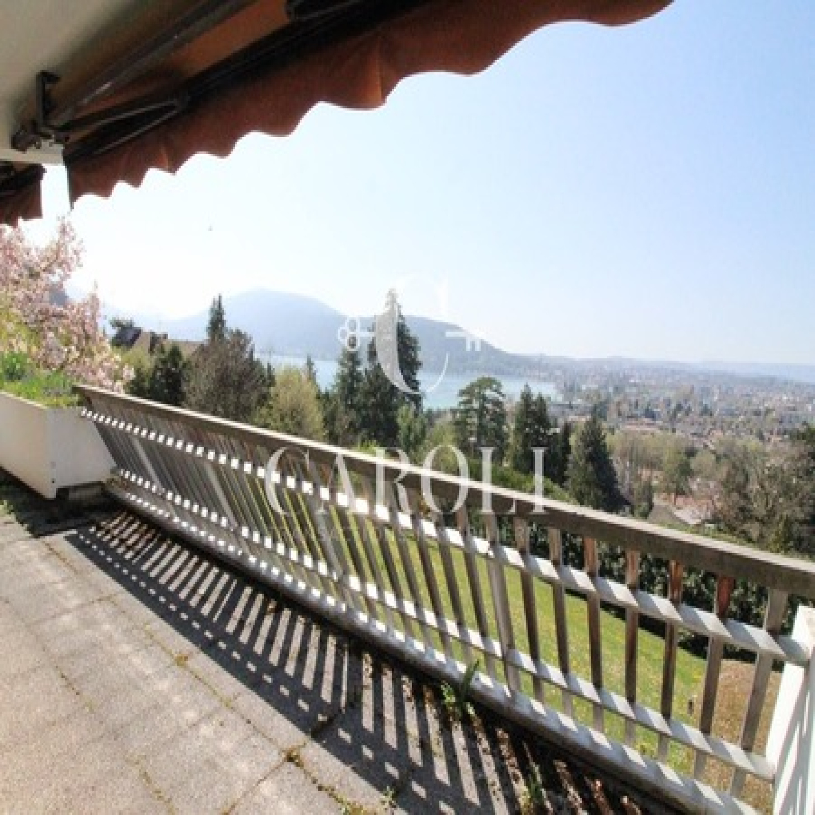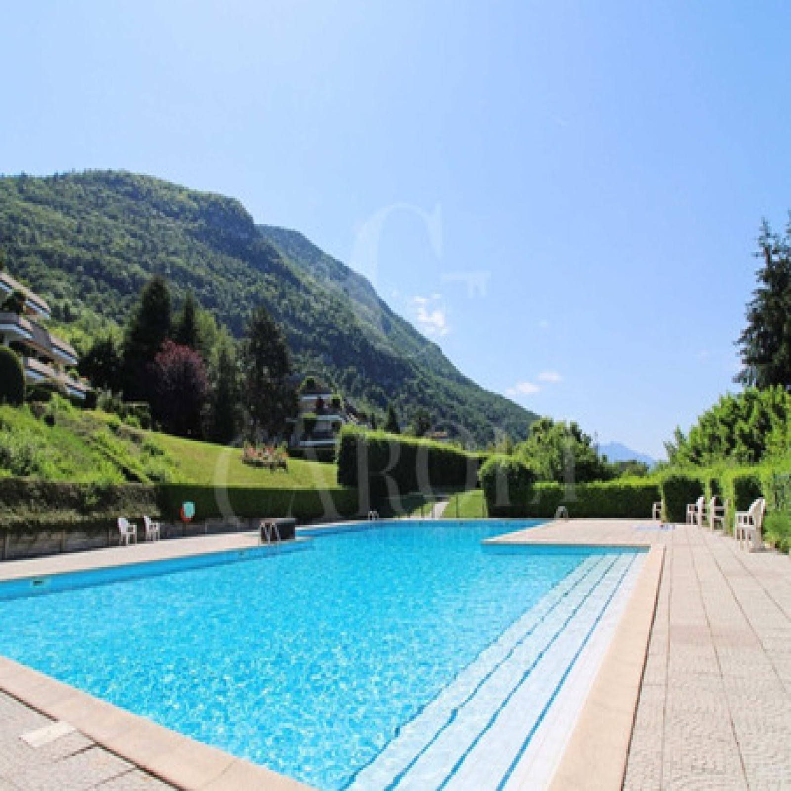 CAROLI TRANSACTIONS IMMOBILIÈRES vous présente cet appartement, rare à la vente, de 77 m² (loi carrez) dans la copropriété Eden Parc avec une grande terrasse de 35 m² offrant une magnifique vue sur le lac et Annecy. Il se compose d'un hall d'entrée, d'une cuisine semi ouverte, d'un salon-salle à manger, de deux chambres, d'une salle de bains et un wc. Terrasse bien exposée (sud-est et sud). Rafraîchissement à prévoir. Pour compléter ce lot, une cave, un garage motorisé avec accès direct à l'appartement. Copropriété de standing avec 2 courts de tennis et piscine. Eden parc se situe dans un secteur très calme et recherché. Nombre de lots : 403. Charges annuelles : 816 €. Pour plus d'informations ou pour une visite, contacter Bruno Rosaz au 06.98.89.34.54 ou par mail à bruno@caroli-immo.com - Visites 7/7