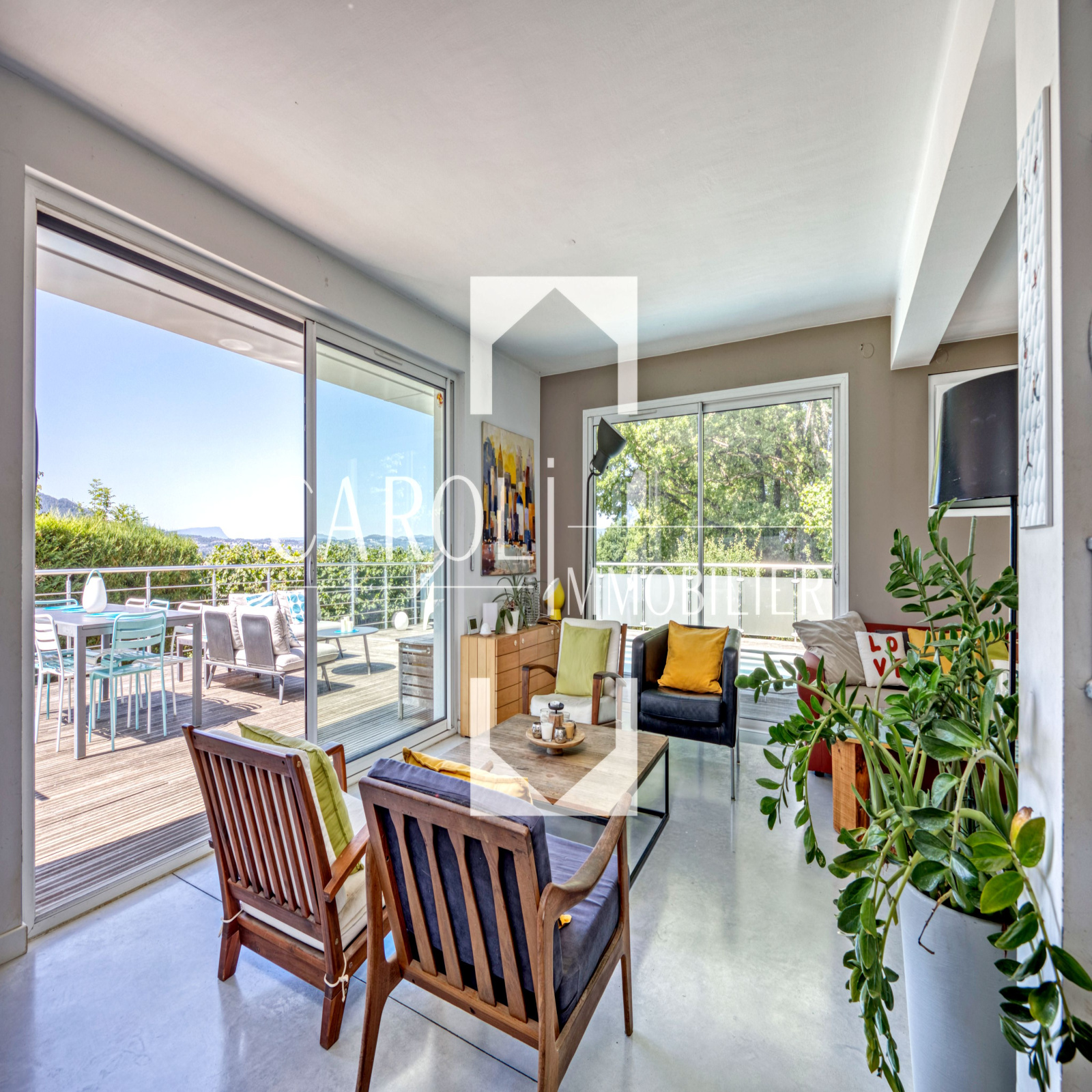 La pièce de vie de 52 m2 s’ouvre par de larges baies vitrées sur une terrasse de 88 m2 avec sa piscine chauffée, sans aucun vis-à-vis.