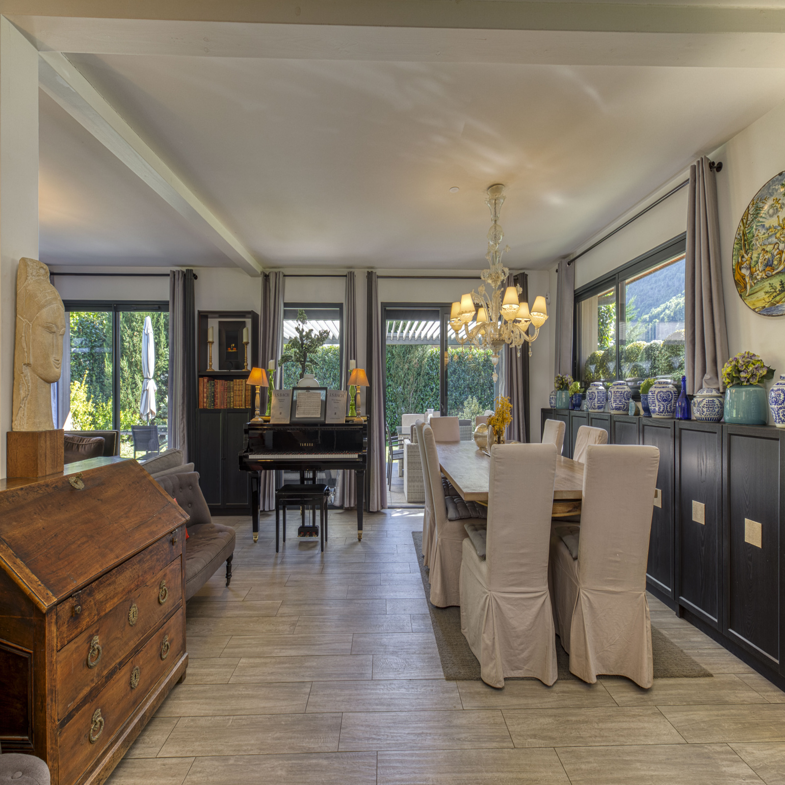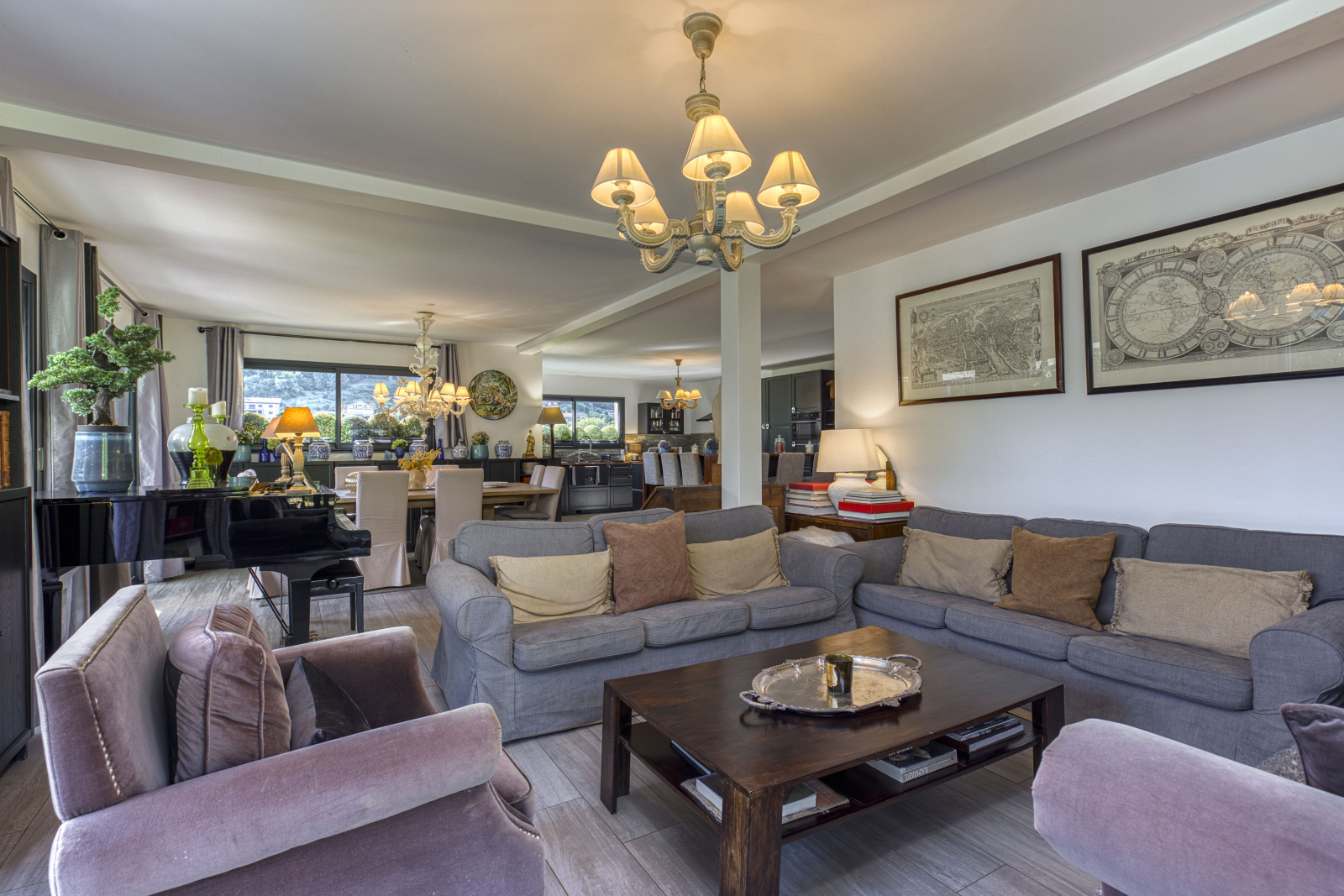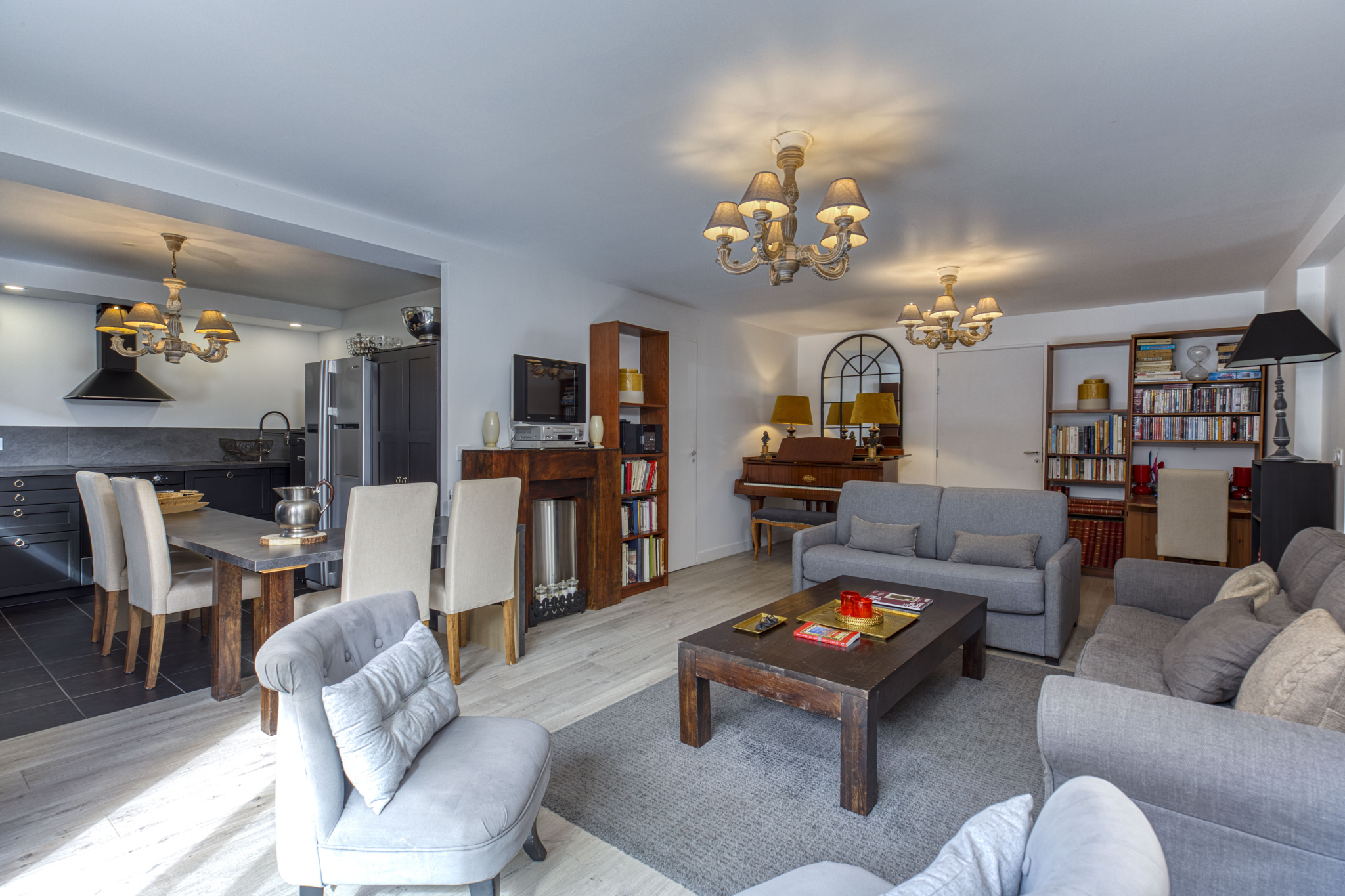 - Rez-de-chaussée : vaste pièce de vie de plus de 68 m² avec salon et cuisine contemporaine fonctionnelle, ouverte sur une terrasse de 74 m² et le jardin. Cet espace extérieur accueille également un jacuzzi, idéal pour des moments de détente. Une chambre avec salle de bain privative complète ce niveau.