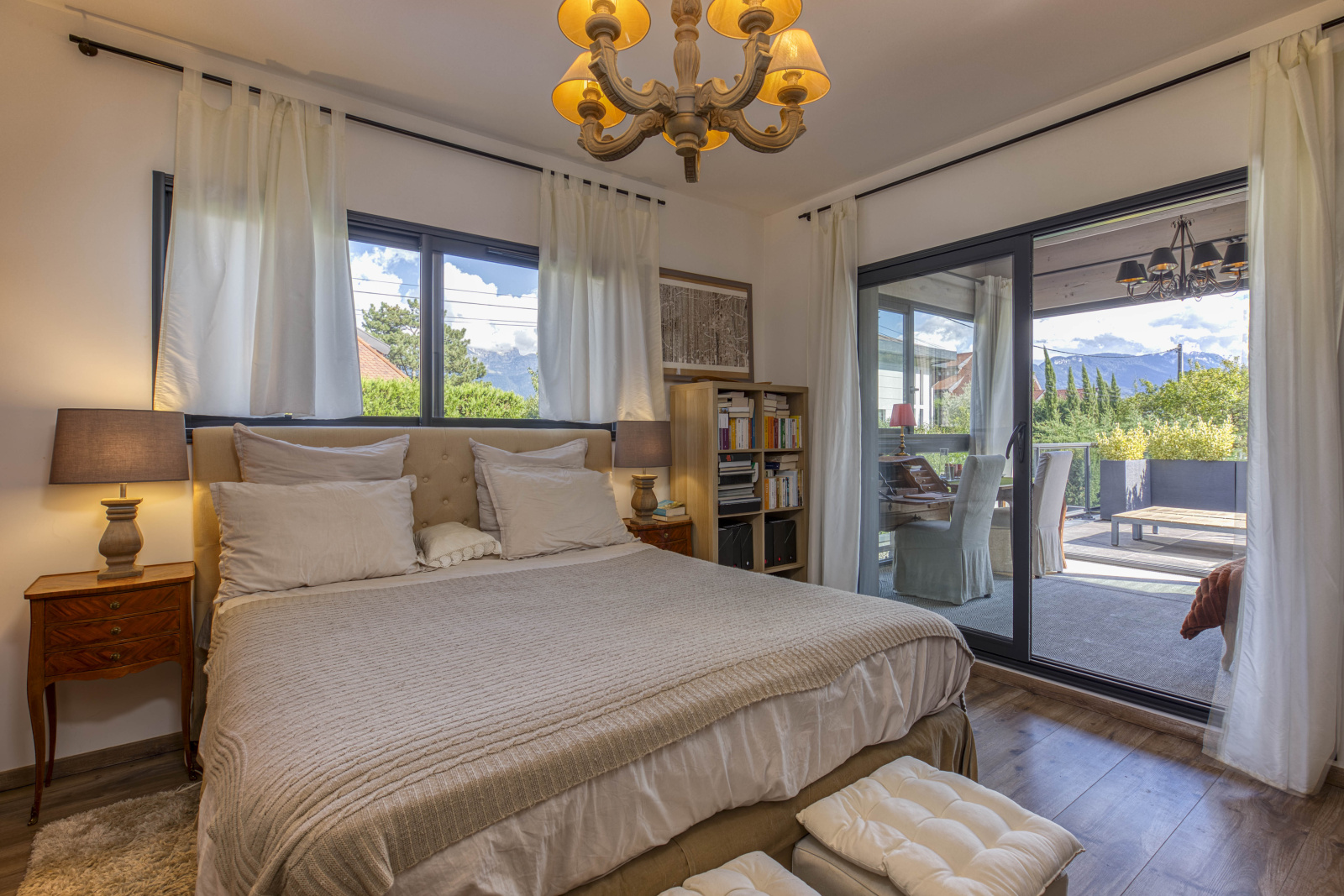 - Étage : 3 chambres supplémentaires, chacune avec salle de bain privative. L’une des suites comprend une véranda aménagée en bureau, prolongée par une terrasse de 40 m² offrant une agréable vue sur le lac.