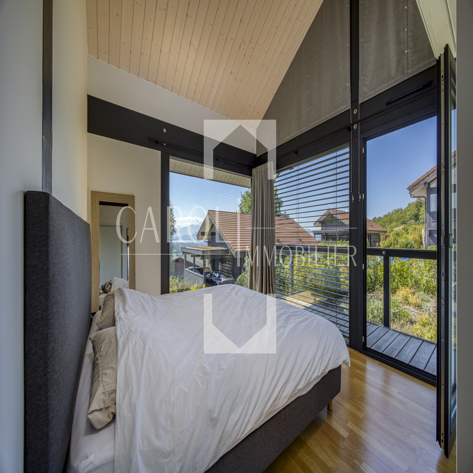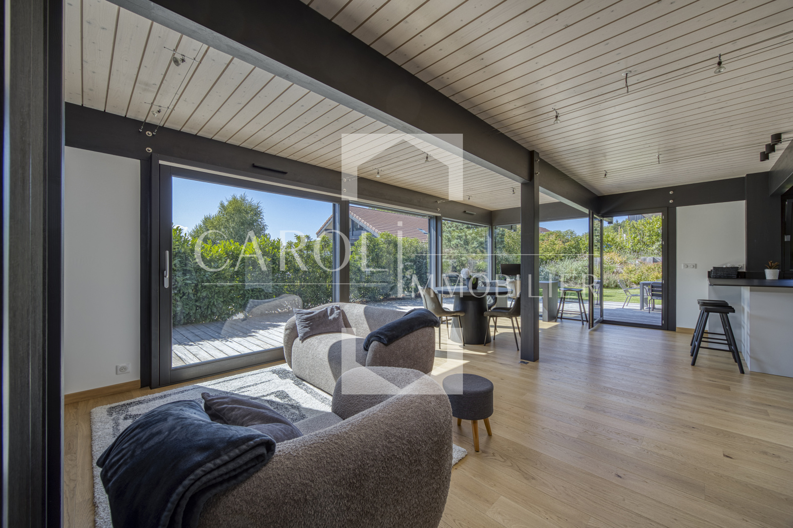 CAROLI Immobilier vous propose en exclusivité cette maison contemporaine de 110m2 du constructeur local DUNOYER, située dans un environnement champêtre à moins de 5 minutes de l'autoroute Annecy nord.