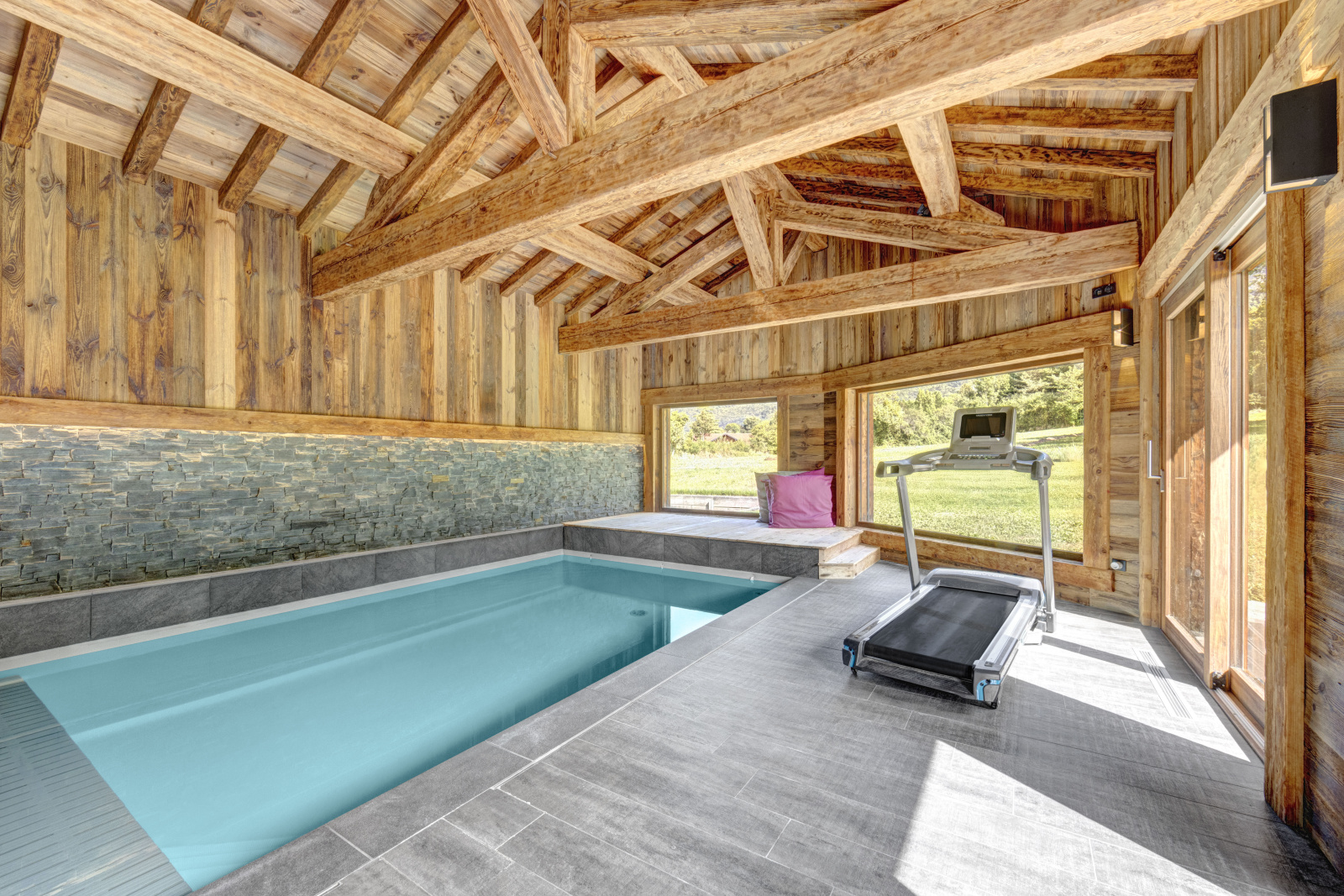 Véritable atout du bien , la piscine intériere profite de larges ouvertures vitrées laissant entrer une lumière abondante et offre un espace bien -etre unique ouvert sur la nature environnante .