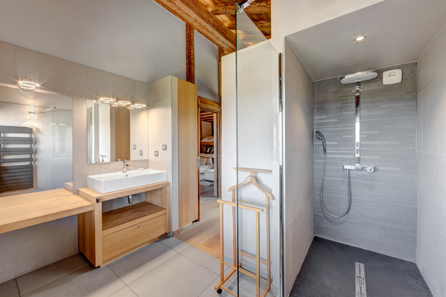 Espace nuit , repartie sur plusieurs demi-niveaux a été conçu pour garantir confort et intimidité .Il comprebd une suite parentale avec dressing et salle d'eau privative , trois chambres supplémentaires ( dont une avec balcon) , ainsi qu'une mezzanine pouvant accueillir un bureau ou un espace de lecture .
